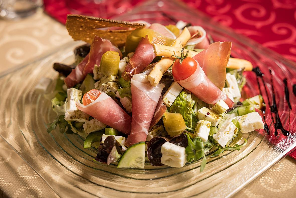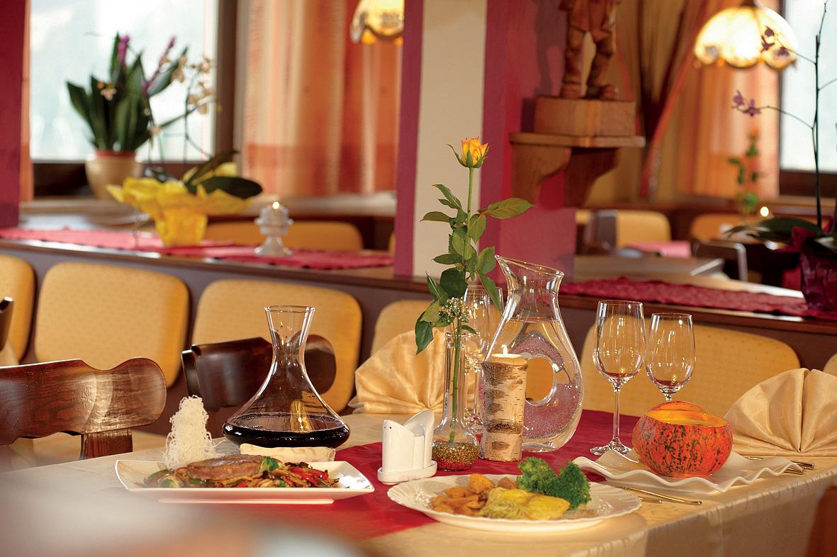 #večeře: servírované menu s výběrem ze 3 hlavních jídel s přílohou (1 jídlo vždy vegetariánské), servírovaný studený předkrm, polévka formou bufetu, salátový bufet, servírovaný dezert, nápoje za poplatek